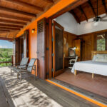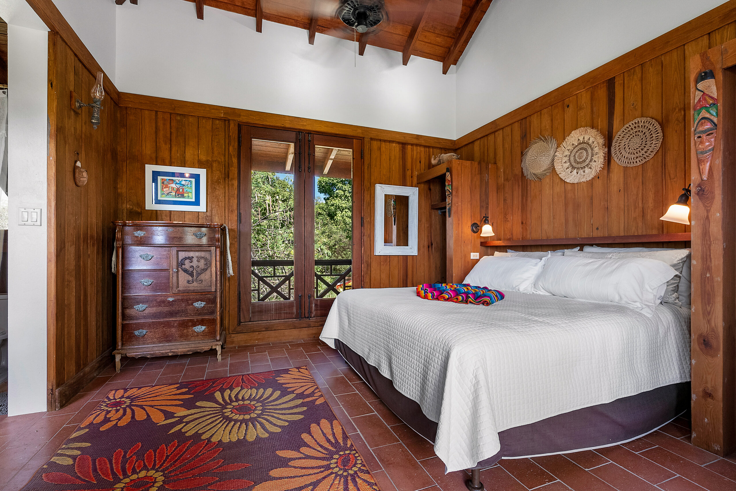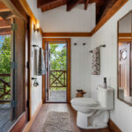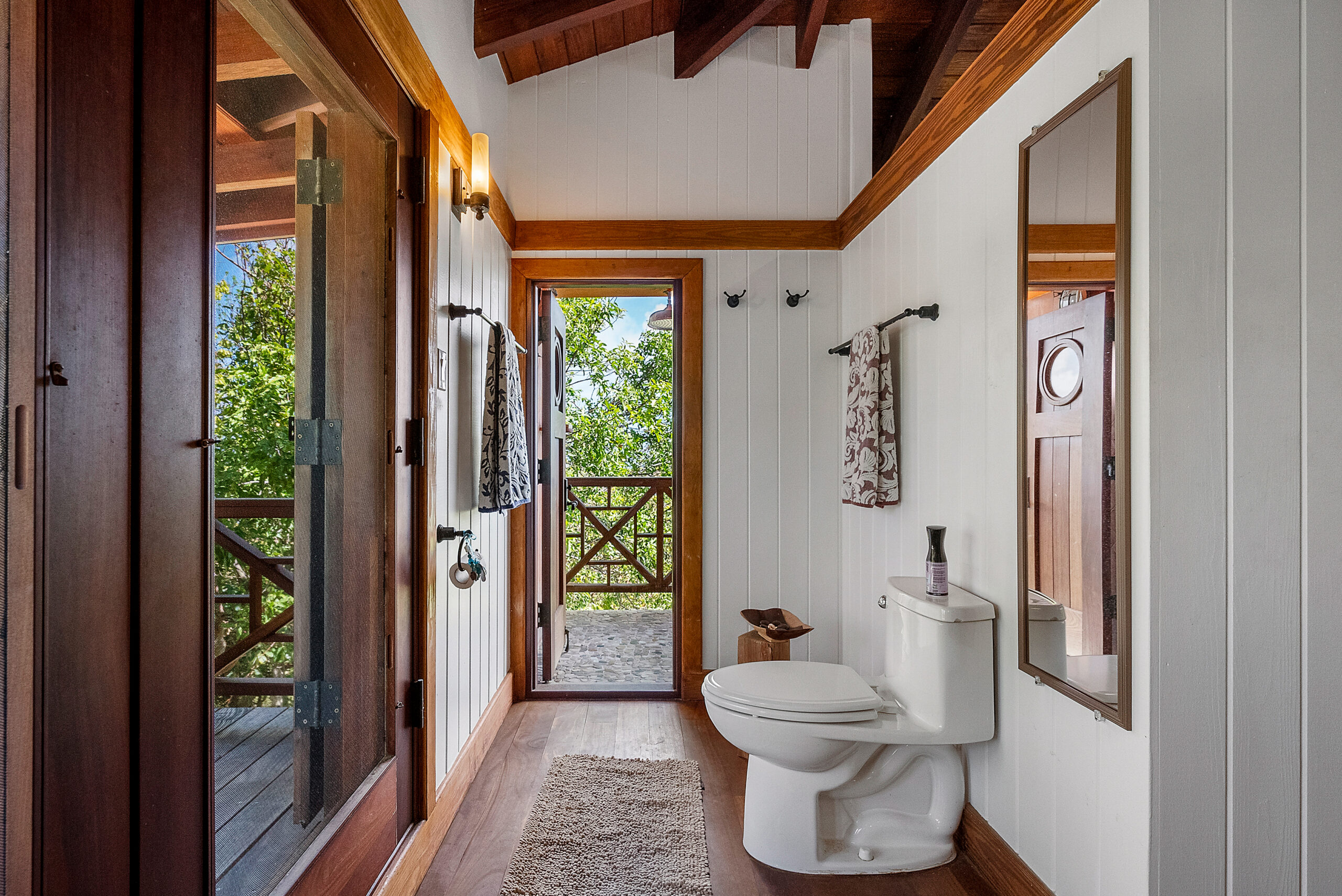 Thoughtfully designed to embrace its surroundings, the residence offers three spacious bedrooms and three-and-a-half bathrooms, each finished with distinctive copper accents and outdoor showers that invite a true connection to nature. Large screened doors and windows allow light and breezes to move freely throughout, blurring the line between indoor and outdoor living. The upper-level primary suite is a private sanctuary in itself, complete with generous closets, a large bathroom, and an open-air shower framed by breathtaking views.